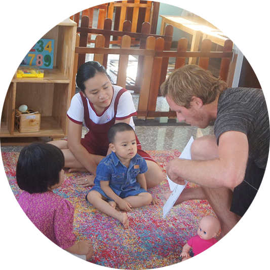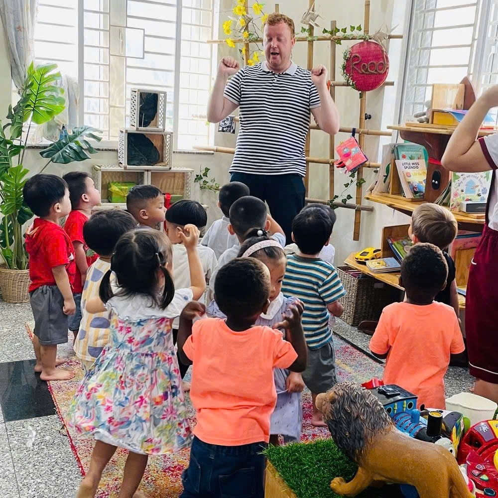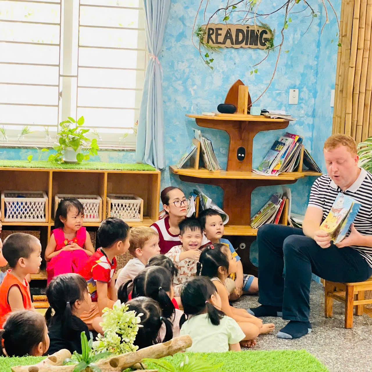 Giờ tiếng Anh là hành trình năng động cùng giáo viên bản ngữ. Qua bài hát, trò chơi, đọc sách, các bé làm quen tiếng Anh tự nhiên như ngôn ngữ thứ hai. Tiết học linh hoạt 15-35 phút, tùy độ tập trung, giúp các bé lớn dần tự tin giao tiếp. Đây là khoảnh khắc yêu thương, nơi ngôn ngữ mở ra thế giới với nụ cười rạng rỡ. -