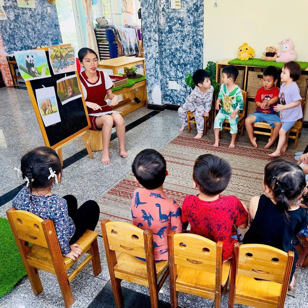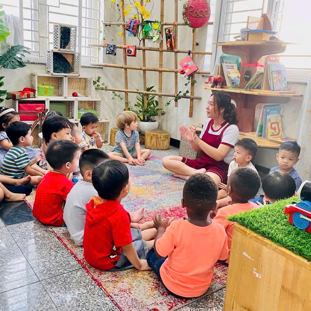 Các bé quây quần bên cô giáo trong hoạt động phù hợp từng độ tuổi. Điểm danh ấm áp, trò chuyện thân thương như “Hôm nay con thế nào?” mở đầu ngày mới. Cô giới thiệu dự án, khơi gợi điều thú vị sắp tới – vẽ tranh, kể chuyện. Đây là lúc gắn kết, các bé háo hức chờ hành trình phía trước với niềm vui và tự tin. -