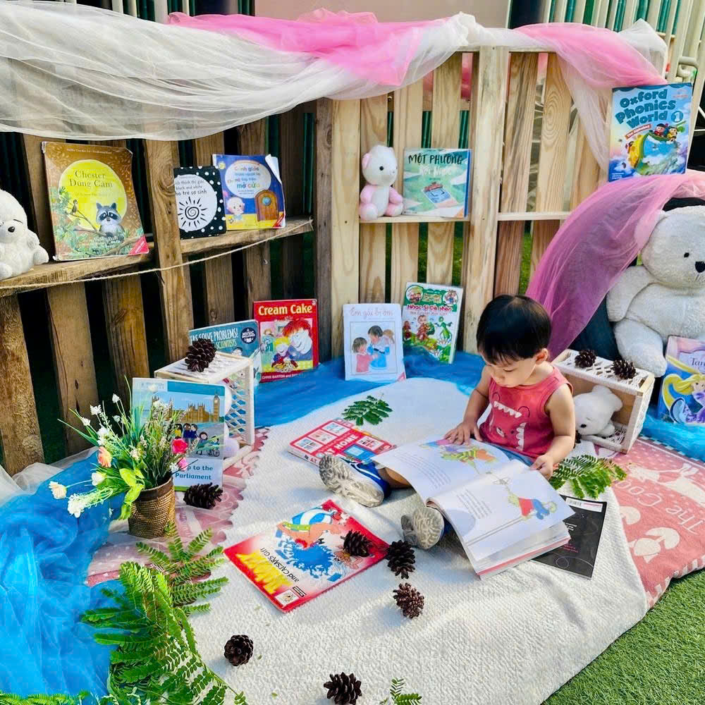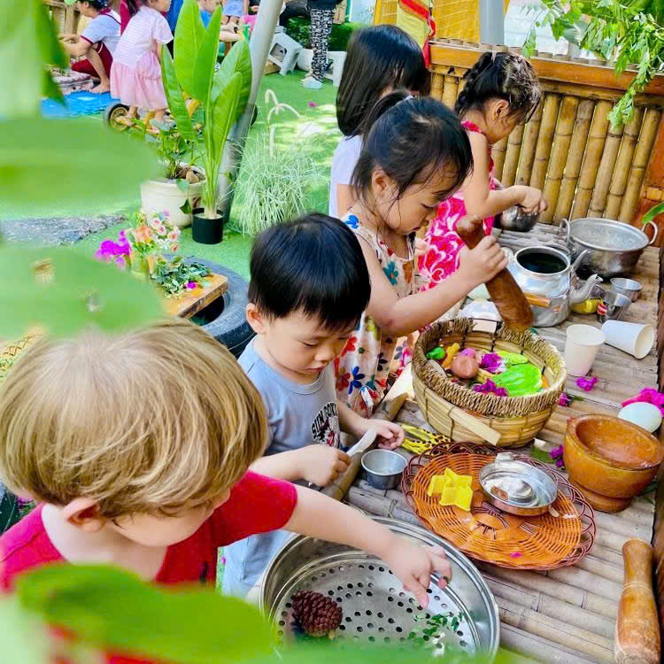 Từ 09:00, các bé hòa mình ngoài trời ít nhất 60 phút với dự án lấy cảm hứng Reggio Emilia. Các “nhà thám hiểm nhỏ” khám phá qua cát, nước, lá cây, theo từng câu chuyện như “Hành trình giọt nước”. Các cô đồng hành, gợi mở để các bé tự do đặt câu hỏi, sáng tạo, lớn lên trong tình yêu và kết nối. -