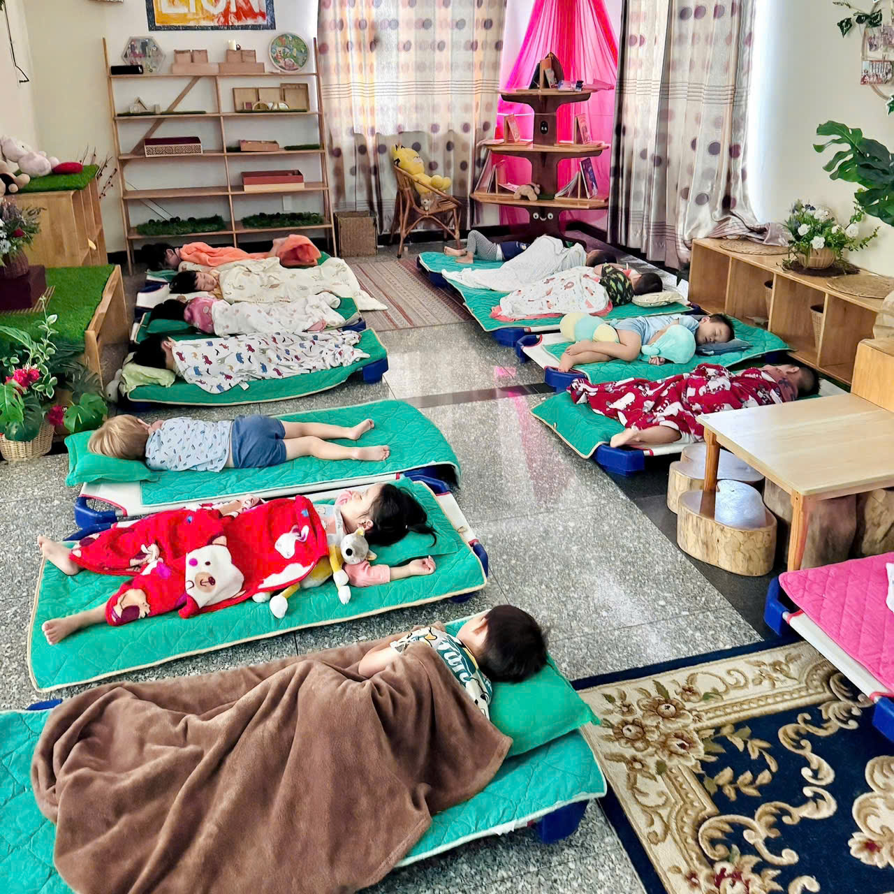 Từ 12:00, phòng học thành tổ ấm với ánh sáng dịu, nhạc ru nhẹ. Các cô vỗ về từng bé vào giấc ngủ, mang đến cảm giác thân thuộc. Giấc trưa giúp các con tái tạo năng lượng, phát triển thể chất, tinh thần, sẵn sàng cho buổi chiều trong vòng tay yêu thương. -