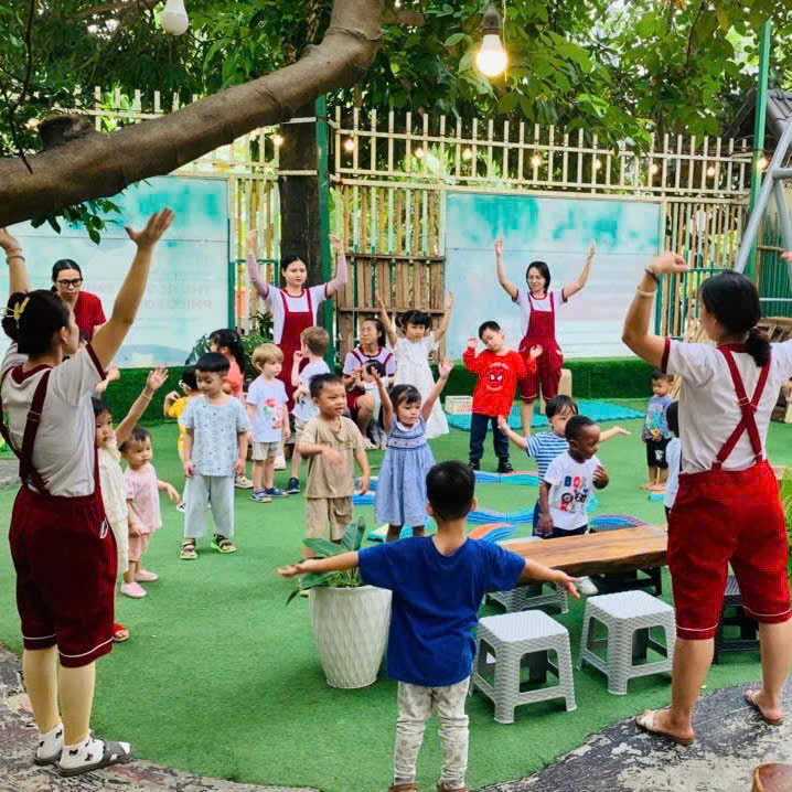 Tiếp nối niềm vui ngoài trời, các bé vận động cùng giai điệu rộn ràng. Dưới sự hướng dẫn của các cô, từng “mầm non nhỏ” vung tay, nhún nhảy như chú chim nhỏ, khởi động ngày mới đầy năng lượng. Các cô mỉm cười khích lệ qua từng động tác: vươn mình như cây, nhảy như thỏ. Đây là lúc cơ thể khỏe khoắn, trái tim ấm lên, sẵn sàng cho ngày khám phá trong yêu thương. -